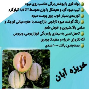 | توضیحات | هیبرید F1 زودرس مناسب کشت در فضای باز وضعیت بوته قوی شکل میوه لامپی عملکرد بسیار بالا کم بذر و فاقد طعم تندی و تلخی سازگاری بالا با شرایط مختلف آب و هوایی رنگ میوه سیاه براق مناسب جهت تازه خوری و صادرات بسته بندی: پاکت 1000 عددی | مشخصات محصول: رقم هیبرید بسته بندی : پاکت 5000 عددی | ? تقریبا زودرس ? غلافهای کشیده ? هر غلاف حاوی ۷ تا ۸ دانه ? ارتفاع بوته بین ۱۰۰ تا ۱۲۰ سانتیمتر ? مقاومترین واریته باقلا ? عملکرد بالا و پرمحصول ? بسته بندی: کیسه 10 کیلوگرمی | مشخصات محصول: رقم هیبرید زودرس شکل میوه گرد وزن نسبی میوه بین 10 تا 12 کیلوگرم عملکرد بسیار بالا بسته بندی : پاکت 1000 عددی | مشخصات : ? رقم هیبرید ?زودرس ? بوته قوی با پوشش برگی مناسب روی میوه ? تیپ میوه گرد و همشکل با وزن متوسط ۲ تا ۲/۵ کیلوگرم ? توربندی بسیار خوب روی پوست میوه ? رنگ گوشت میوه نارنجی بازارپسند با حفره میانی کوچک و سفتی بالا، شیرین و خوش طعم ? تحمل نسبی به بیماری پژمردگی فوزاریومی، ویروس لکهنکروزی خربزه و سفیدک پودری ? بستهبندی: پاکت ۱۰۰۰ عددی | ? رقم هیبرید